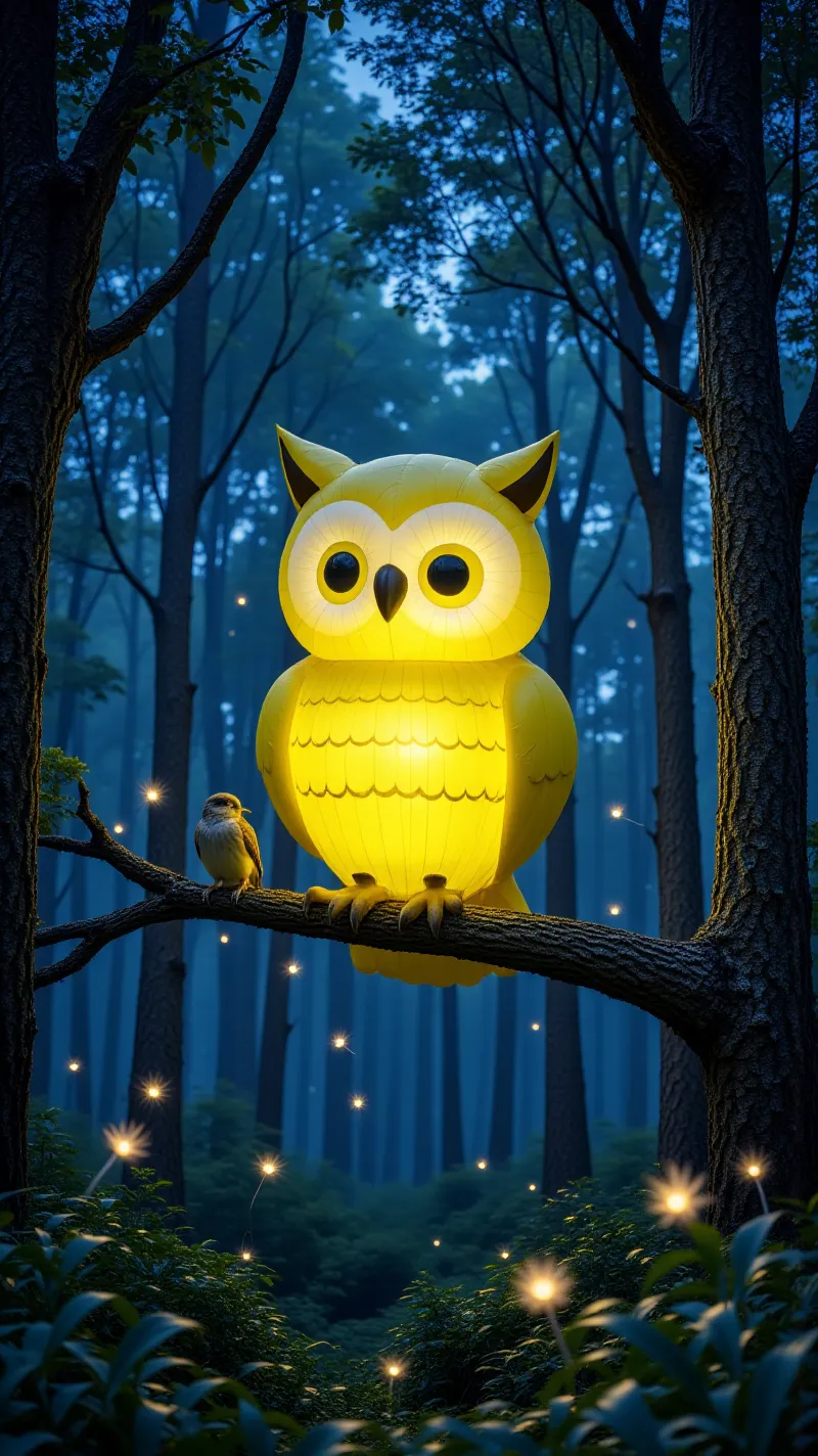 e.g."In the forest at night, a yellow owl perches on a branch, beside it is a sparrow. Fireflies are fluttering around."