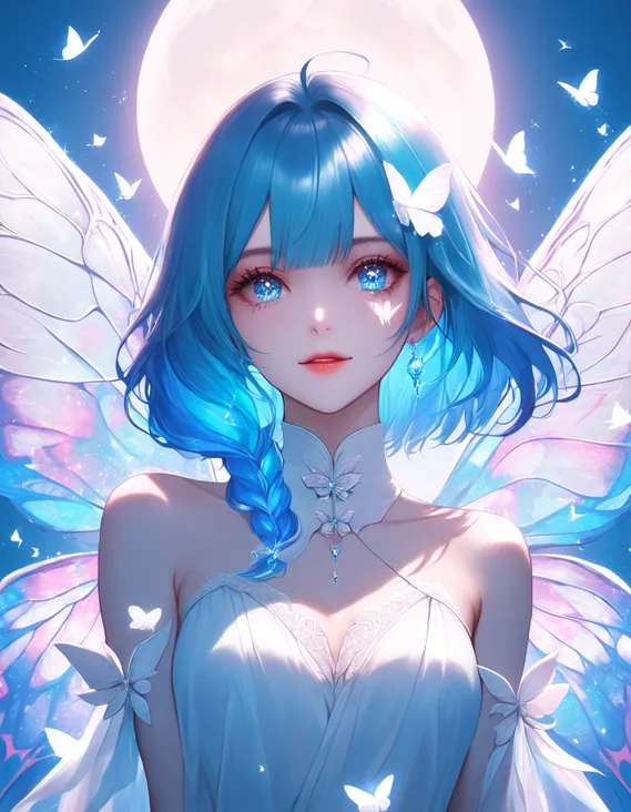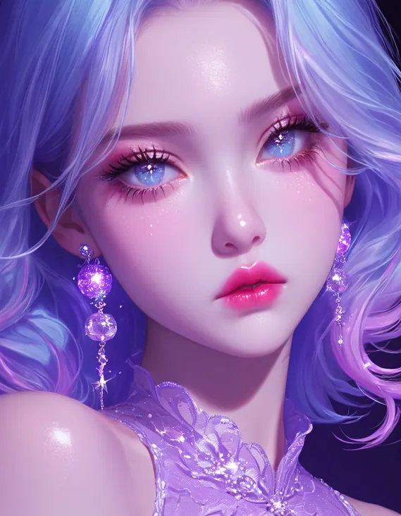 fantastical, ethereal aesthetic, A girl with dark, curly hair adorned with golden stars. She wears a glowing, ethereal dress and gently touches her chest, surrounded by a soft, magical light.
