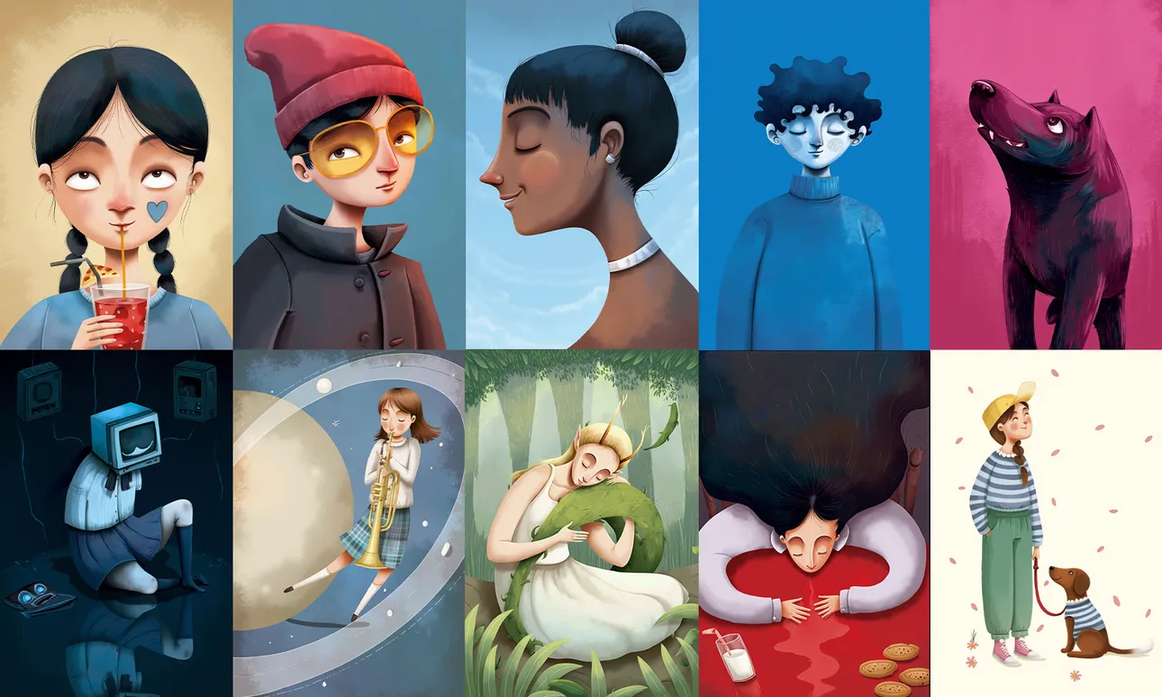 该模型擅长刻画丰富的情境氛围,无论是静谧森林、宇宙幻想,还是日常生活中的童年片段,都能用极具故事性的构图与光影展现出来。线条圆润柔滑,色彩融合细腻,常出现大面积的冷暖对比以及细腻的渐变处理,给人一种柔和梦幻之感,具备极强的亲和力与治愈感。我将其命名为 “Kiddobook”,寓意孩童视角下的奇思妙想与纯粹情感。该模型泛化能力出色,适用于儿童图书、插画故事、视觉诗集、艺术明信片等多个领域。