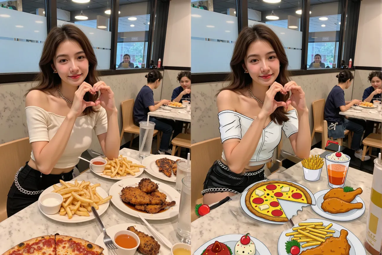 上述案例提示词参考:一位身着手绘的白色露肩上衣和黑色链条装饰下装的亚裔女士正在餐厅里用餐。她面前的餐桌上摆满了手绘的美食,有披萨、薯条、炸鸡、烤肉、饮料等等。她用双手比出一个心形,营造出轻松愉悦的用餐氛围。