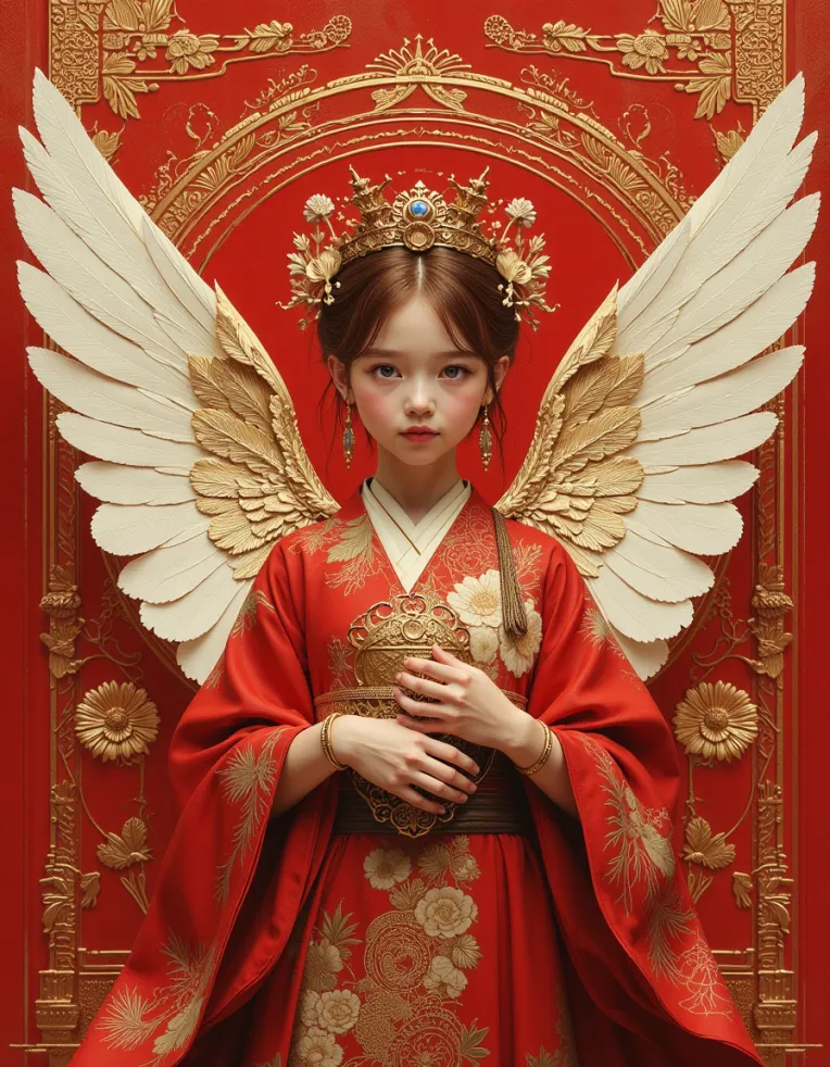 "An ethereal being with porcelain-like skin, wearing a mask decorated with golden vines, surrounded by festive red, f3s."