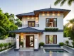 Created with45T1,45T2,outdoor, 45T2, Contemporary Vietnamese villa with a sophisticated two-story layout, featuring a gracefully sloped tiled roof adorned with intricate eaves, expansive glass windows that invite warm, soft natural light, and elegant wooden doors with ornate metalwork details. The facade is a harmonious blend of smooth white plaster and dark stone accents, creating a striking contrast, with subtle texture and nuance. Set in a beautifully landscaped garden filled with vibrant tropical plants, blooming flowers, and manicured lawns, the scene is bathed in cinematic golden hour sunlight, casting soft, warm shadows that enhance the architectural details, with a sense of serenity and luxury.