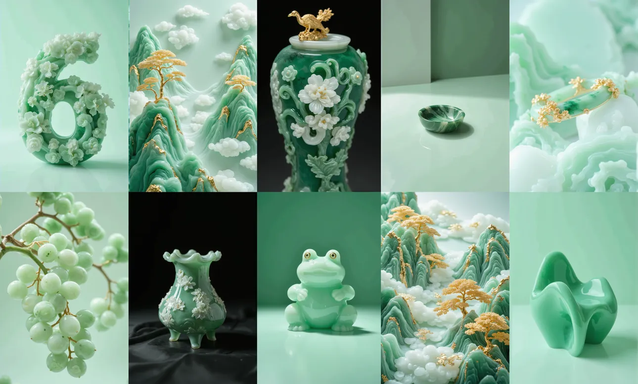 Prompt:Photographs taken from close-up angles are realistic. The subject is a jadeite vase decorated with a floral pattern in the shape of the letter "6". The background is a soft pastel green background. The vase design is complex,with floral patterns of flowers and leaves,and has a smooth,polished finish. The flowers are arranged in a symmetrical pattern,each petal has a unique shape and texture,and the leaves have fine veins and curves. The overall aesthetic is elegant and delicate,with an emphasis on the natural beauty of jade and the intricate details of the floral pattern. The background is a pure light green,creating a subtle contrast with the vibrant green,