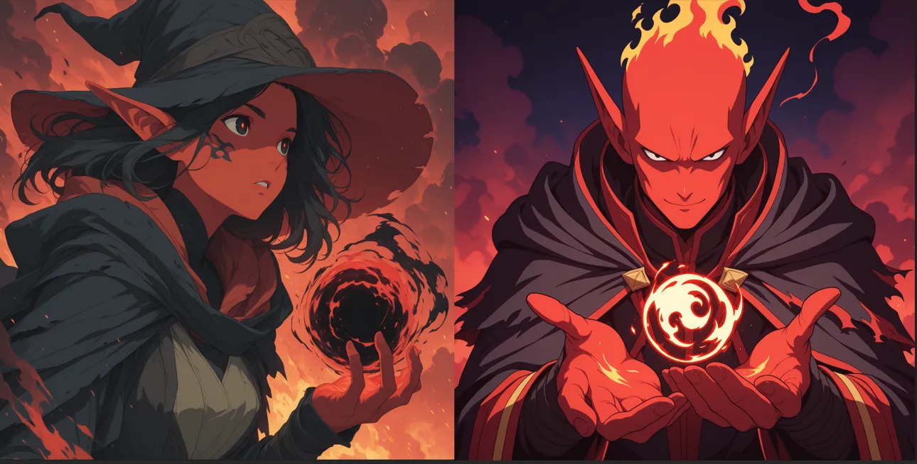 - Example prompts used:"A close up 2D anime-style illustration of an evil little red wizard demon with glowing black eyes and a point ears, red skin, wearing a black, tattered magical robe with red details, conjuring a massive black blazing black fireball with both hand, smoke and black fire swirling around him, the firelight casting dramatic shadows on his face, torn cape billowing behind him, fantasy burning tavern in the background, fiery color palette of crimson, amber, and dark black, clean cel-shaded anime linework, high-detail, Japanese anime concept art style, hkmagic"