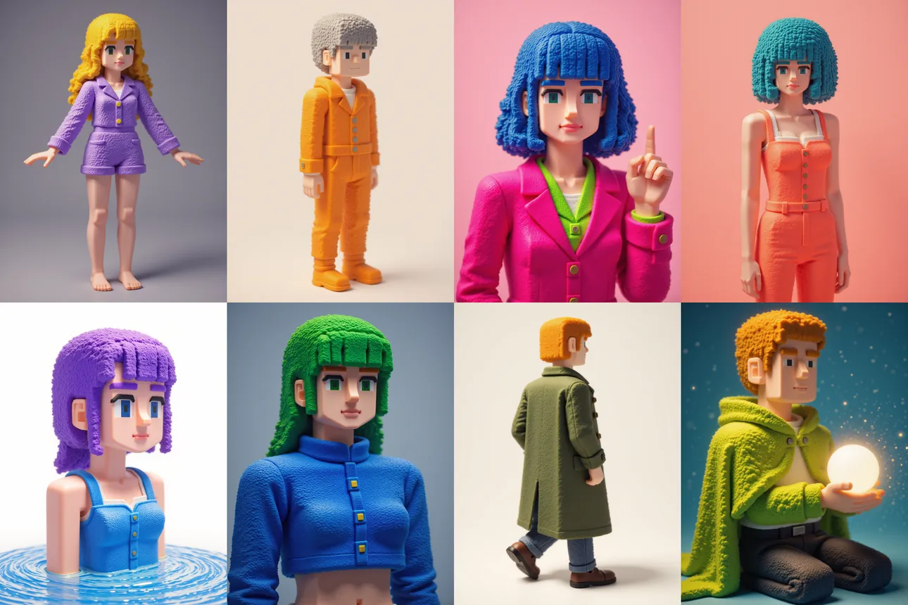 游戏与虚拟现实开发:方块人风格AI图片生成模型可快速创建低多边形3D角色、场景素材,适配像素风独立游戏及VR/AR应用的视觉需求,降低原型设计成本并提升开发效率。