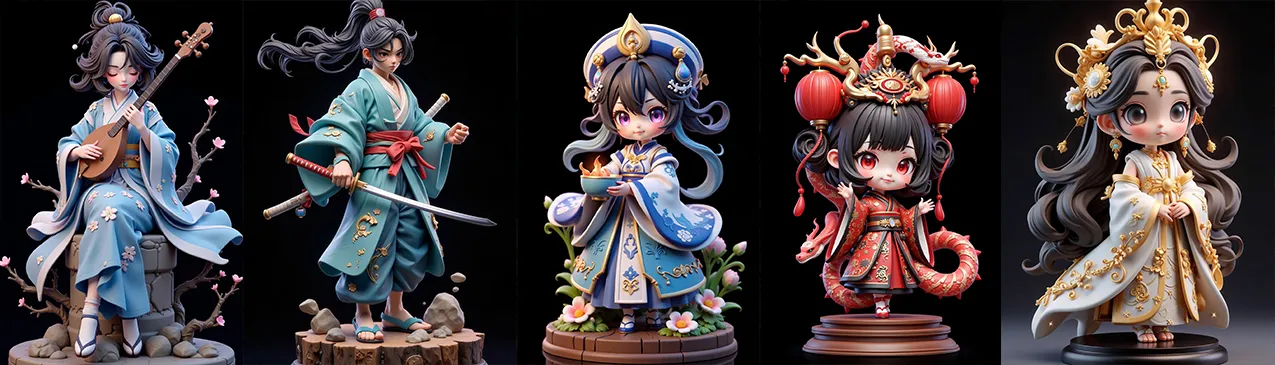 Example: vbang box toy, anime-style doll, chibi proportions, pastel colors, mint green hair, big blue eyes, white dress with pink floral patterns, cat ears headband, delicate gold accessories, standing on a round pedestal, soft lighting, neutral background, intricate details, cute and whimsical, digital art, high-quality rendering, elegant and charming, fantasy character, fantasy-themed, ethereal and dreamy atmosphere