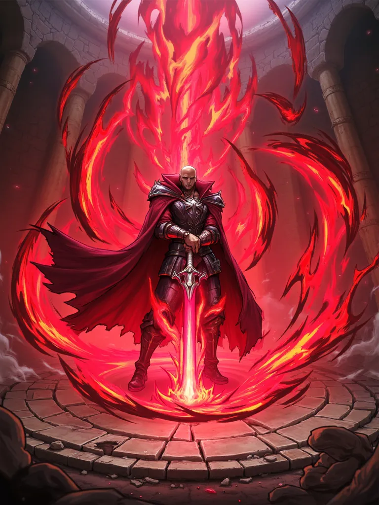 The central figure is an imposing, muscular male warrior with a bald head, standing on a circular, stone-paved courtyard. He is dressed in a flowing, deep red cloak that billows in the wind, and his attire suggests a medieval or ancient warrior. The cloak is adorned with intricate, metallic details, adding to its regal appearance. He wields a large, double-bladed sword with a white handle, held in both hands, positioned behind his back.