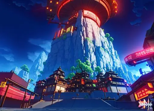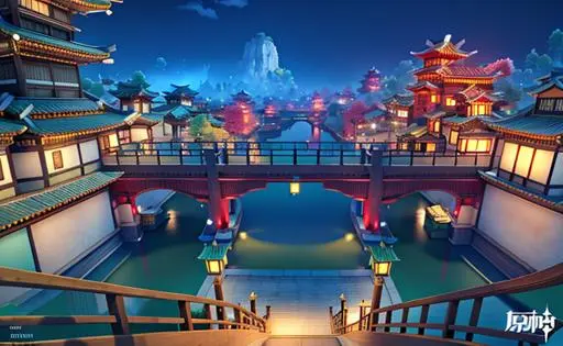 Liyue Harbor, scenery, night view, no people, trees, East Asian architecture, lanterns, sky, outdoors, bridge, buildings, tables, mountains, night sky, railings