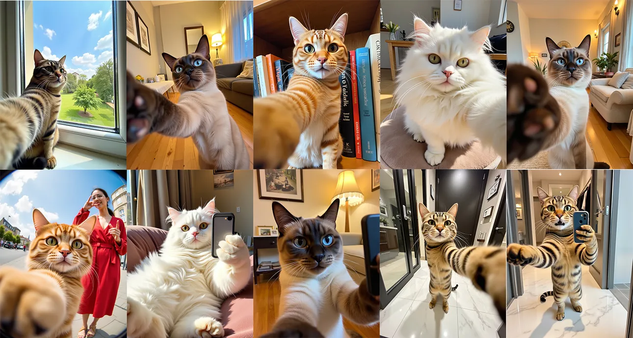 HIRO. A sleek Siamese with striking blue eyes is busy taking a selfie with the wide - angle camera, reaching out a paw from a cozy living - room corner under warm lighting.