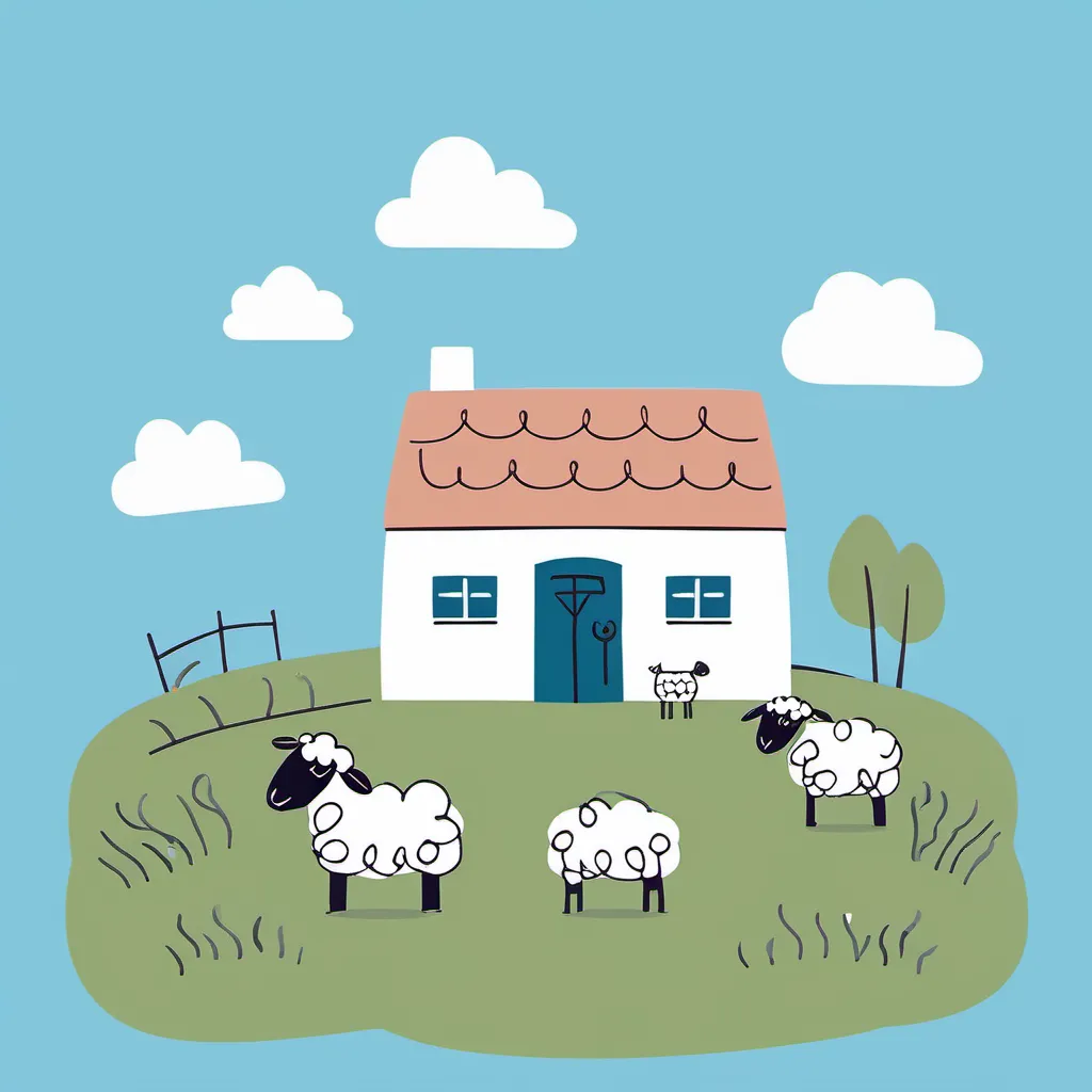 示例2:简笔插画,扁平插图一个小农舍,在农场,羊,草地,蓝天,云彩,极简插图