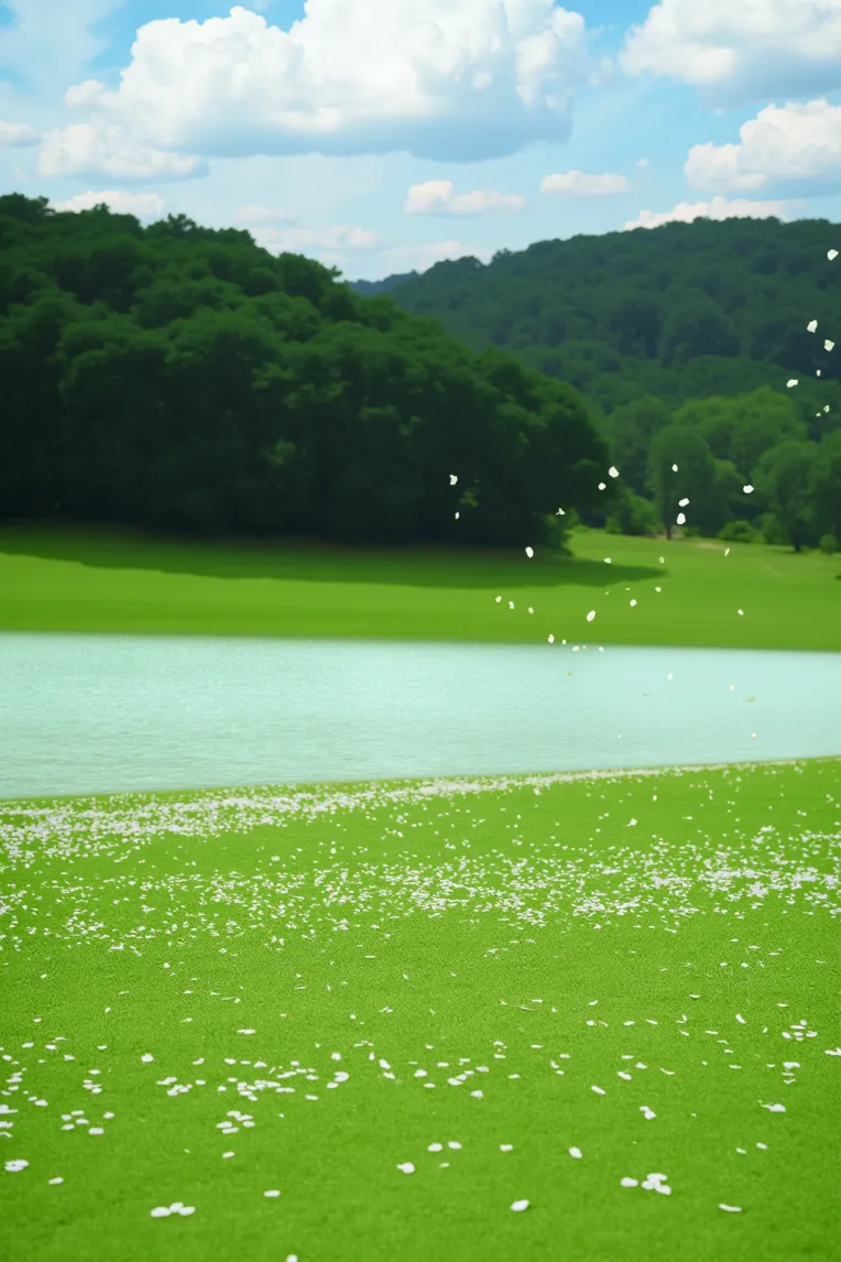 A serene landscape featuring a calm lake surrounded by lush green hills under a bright, partly cloudy sky. The grass in the foreground is dotted with small white petals, with more petals floating gently in the air, giving a sense of a peaceful breeze. The vibrant green grass contrasts with the rich blue sky and the deep green trees, creating a tranquil, natural scene.