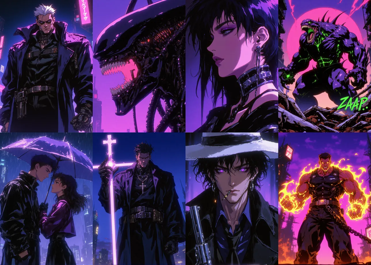 - “A dark hero aiming a revolver, rain falling in glowing neon streaks”