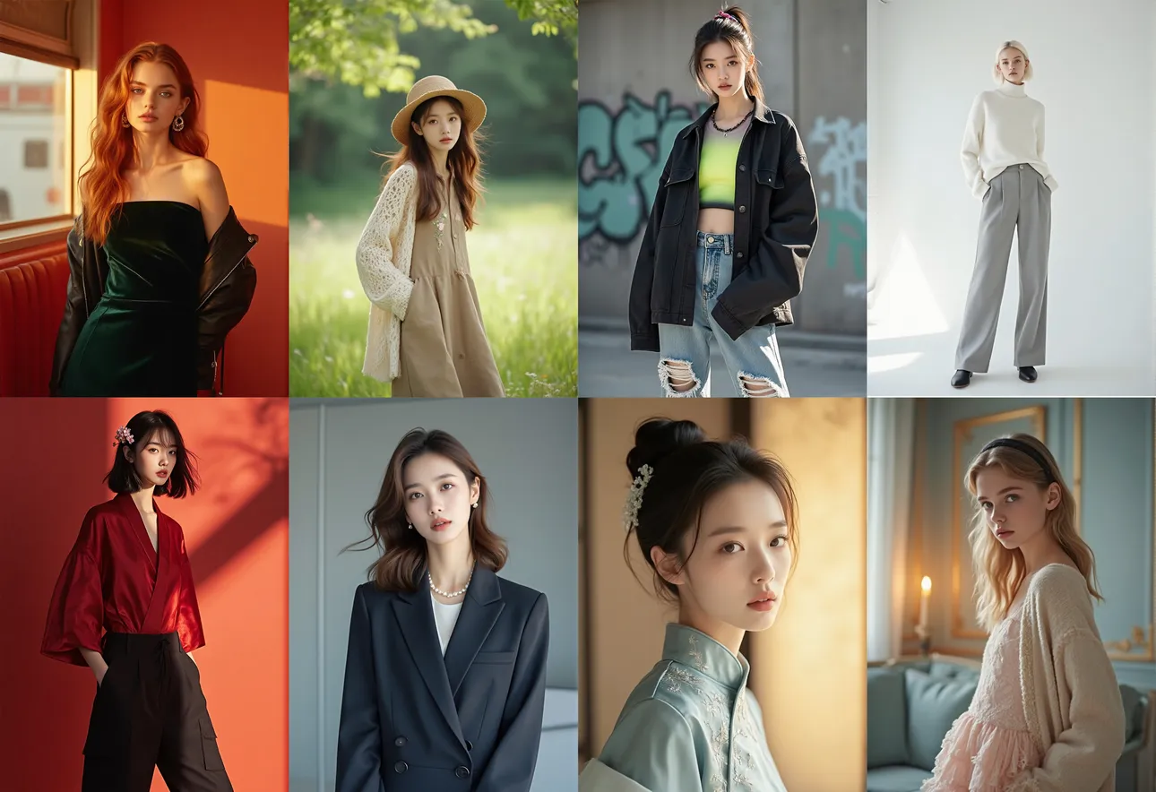 本模型可轻松生成中外少女时尚摆拍素材,内容并具备良好的质感,在精细细节表现上有丰富的表达。
