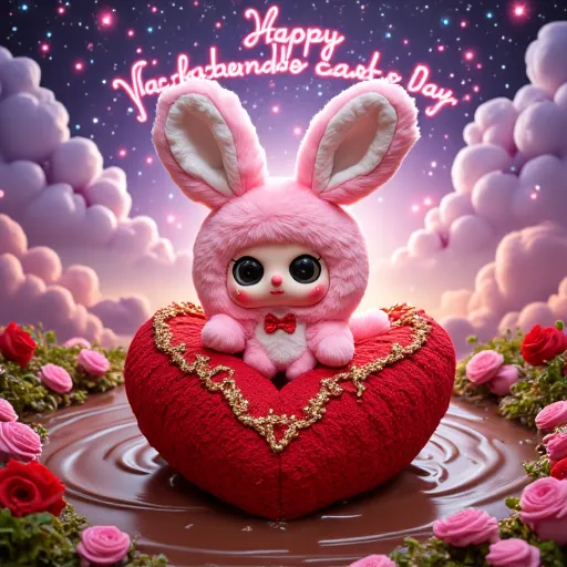 4️⃣ A beautifully detailed plush toy baby bunny with oversized, glossy black eyes, a charming pink bowtie, and fluffy, cloud-like fur lounges on a giant red velvet cake shaped like a heart. The cake is floating on a river of melted chocolate, with roses growing along its edge. Above, the sky is a canvas of soft pinks and purples, where glowing candy-shaped constellations form the words 'Happy Valentine's Day' in a whimsical, celestial script. BabyThree