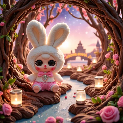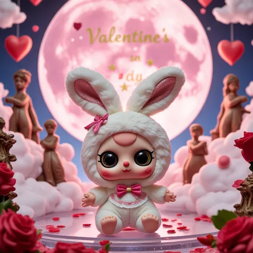 1️⃣ A plush toy baby bunny with oversized, expressive black eyes, a silky pink bowtie, and fluffy white fur sits inside a swirling vortex of chocolate rivers and rose vines that stretch infinitely into the sky. Heart-shaped lanterns float around, casting a soft, romantic glow. In the distance, a bridge made of sugar spans a dreamy, pastel-hued galaxy, where a glowing banner spells 'Happy Valentine's Day' in magical golden dust. BabyThree