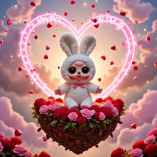 3️⃣ A highly detailed, photorealistic image of a plush toy baby bunny with oversized, shiny black eyes, a delicate pink bowtie, and incredibly fluffy, textured white fur. Instead of a nursery, the bunny sits on a floating heart-shaped island made entirely of chocolate and red roses. The sky is a swirling mix of pink and gold, with glowing candy hearts drifting like fireflies. A shimmering neon ribbon in the air spells out 'Happy Valentine's Day' in elegant cursive. BabyThree