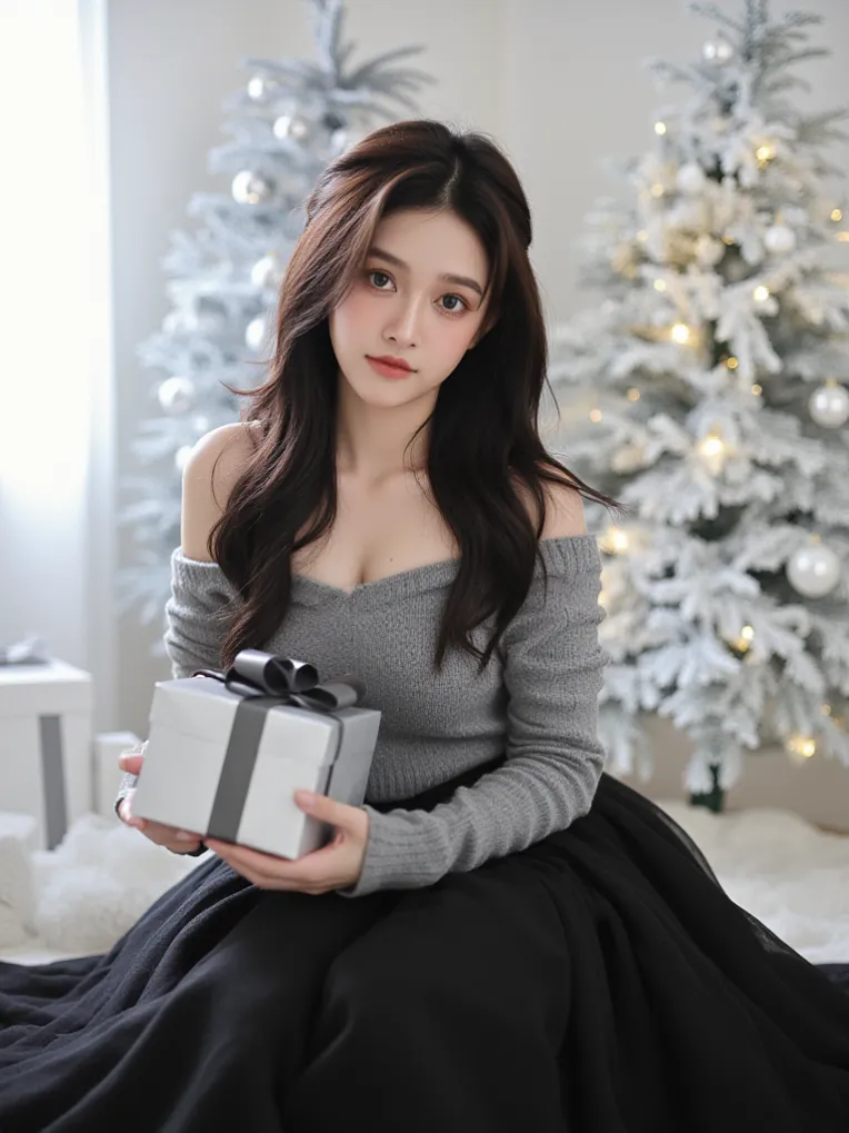 black christmas, a beautiful vietnamese woman sitting on a white furry rug in front of a Christmas tree. She is wearing a black dress with a white ribbon tied around her neck and white gloves. She has long dark hair and is looking directly at the camera with a serious expression. The Christmas tree is decorated with silver and gold ornaments and there are several gift boxes scattered around the room. The overall mood of the image is festive and cozy. High detail, concept art, fantasy style, analog film color, Soft, dreamy lighting.