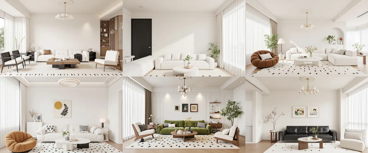 The AI model can quickly generate 3D scene diagrams of minimalist-style living rooms, assisting designers in accurately reproducing the texture of natural materials and asymmetrical layouts, and achieving efficient preview of spatial aesthetics.