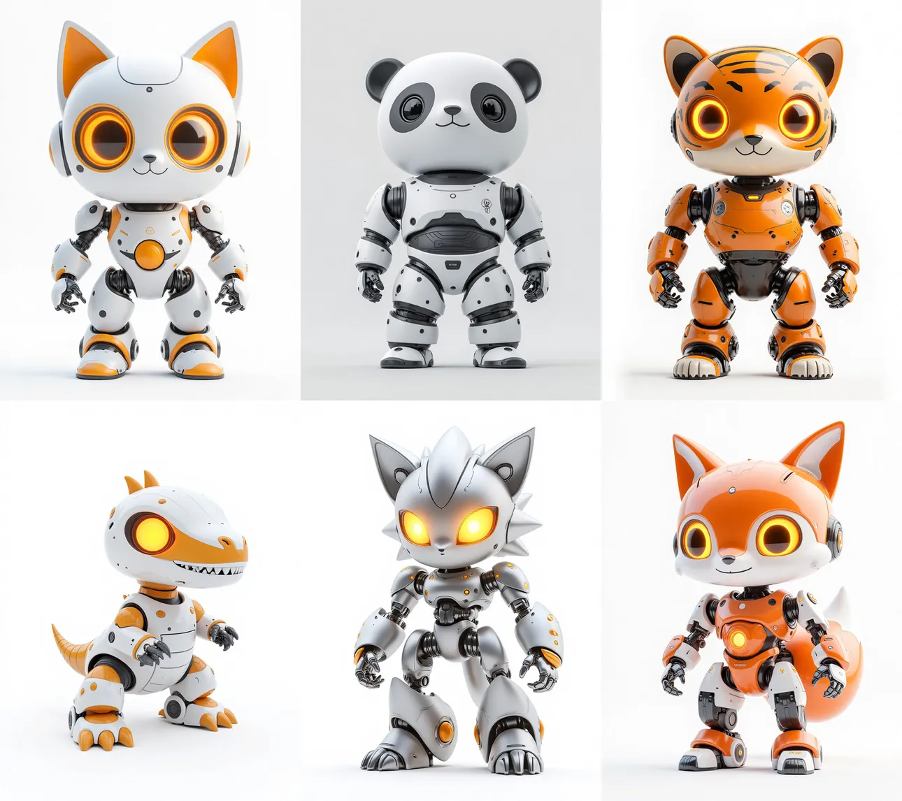 A highly detailed CGI rendering of a cute,anthropomorphic tiger robot with large,glowing orange eyes,orange and black striped body,and sleek,futuristic design. The robot has a small,rounded head with tiger ears,and a smiling expression. It stands against a plain white background,showcasing its advanced,mechanical limbs and joints.,