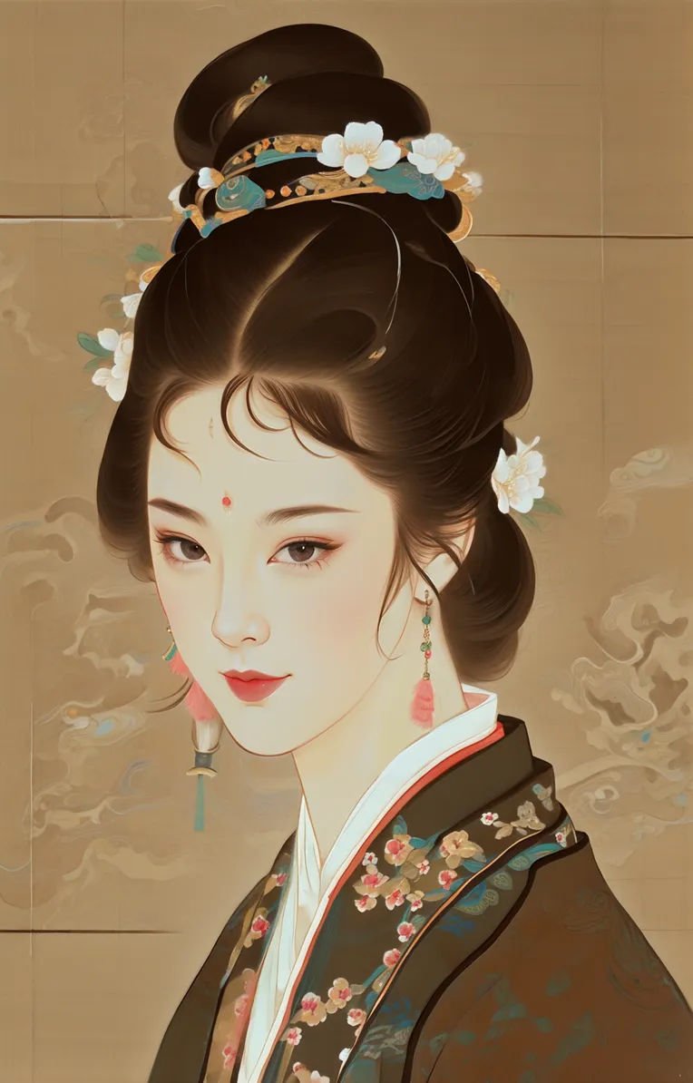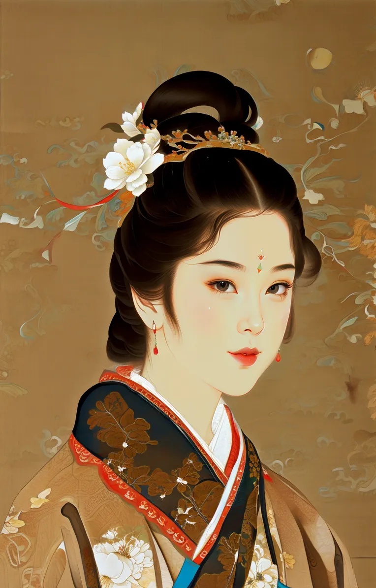 Prompts: claborate-style painting, Hanfu, corolla, flower, high resolution, absurd resolution, wallpaper, (brown eyes), front view, portrait,