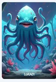 Lora’s glowing turquoise skin, adorned with sparkling bioluminescent spots, makes it look like a living star shining in the depths of the ocean. Its big, round, and gleaming eyes radiate intelligence and charm, while its mischievous smile not only conveys friendliness but also hints at a mysterious, curious personality that captivates everyone it meets.