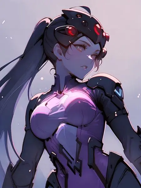 触发词:ponytail或long hair,purple bodysuit,head mounted display,black gloves,black gauntlets,armored boots,stud earrings