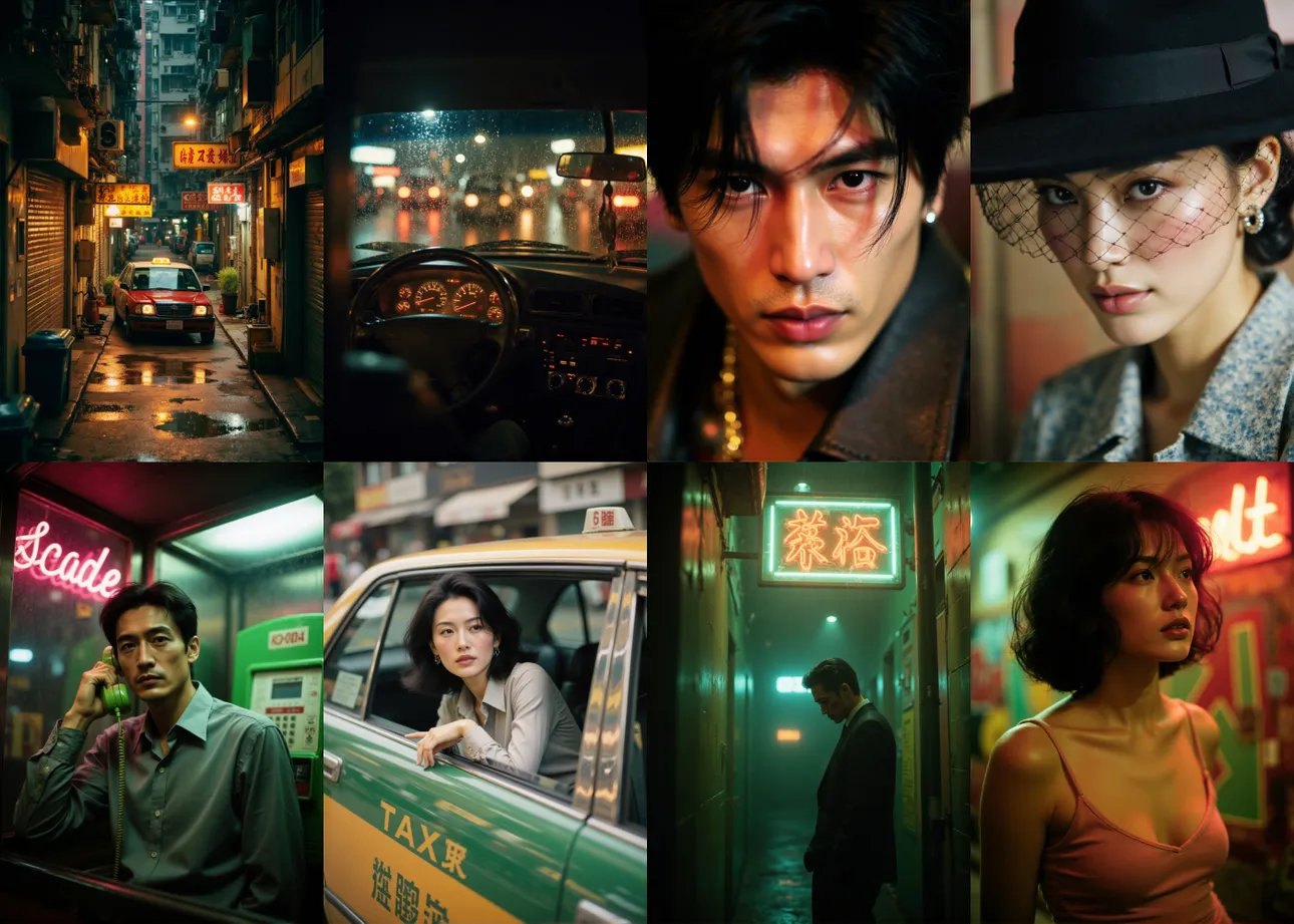 风格特征介于复古胶片人像摄影与王家卫电影镜头语言之间,适用于打造高质感都市角色模型、剧情视觉短片、AI摄影集训练等任务。