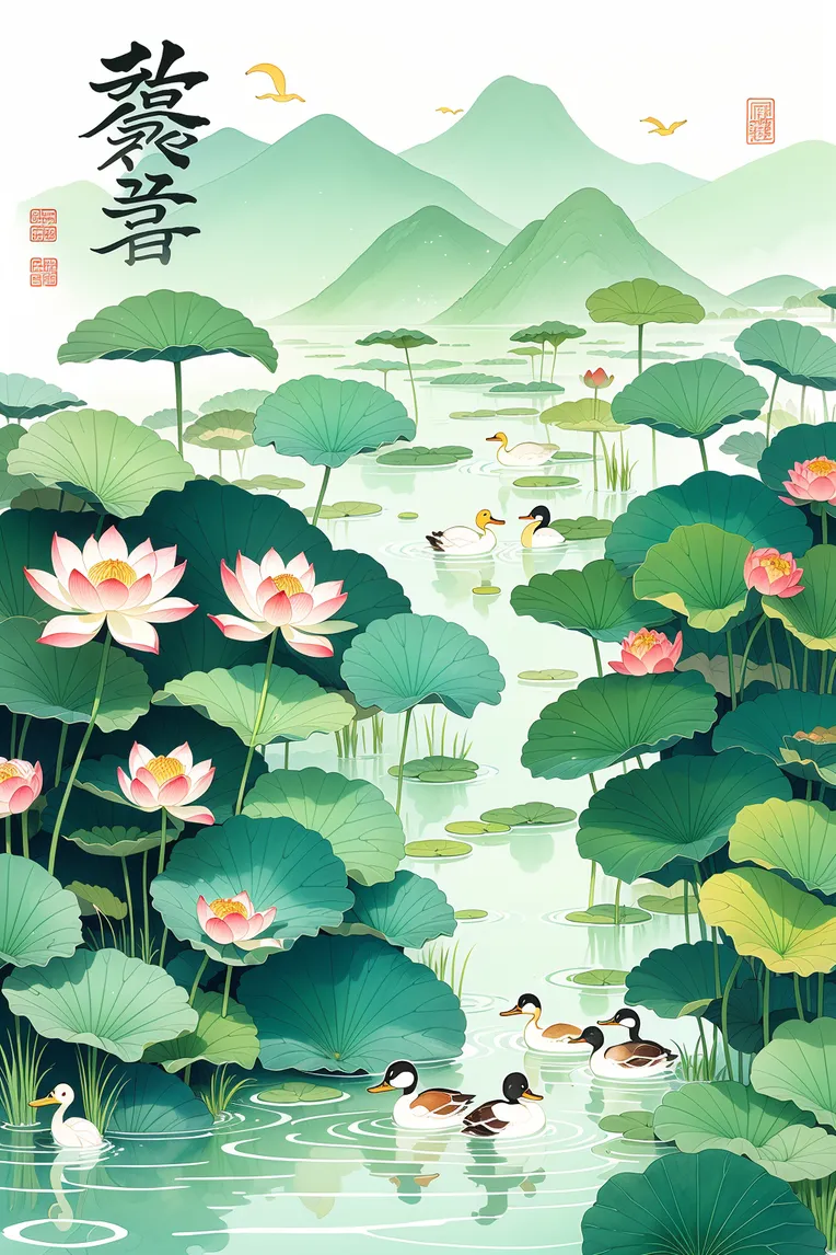 In long summer solar term, lotus blooms in the pond, a lovely wild duck hides under lotus leaves, (illustration, Mori style, watercolor overlapping, beautiful, elegant, traditional Chinese color matching, 24 solar terms in China), landscape painting, Three parts: the scene description words before the bracket can be changed, the trigger word after the bracket is lora