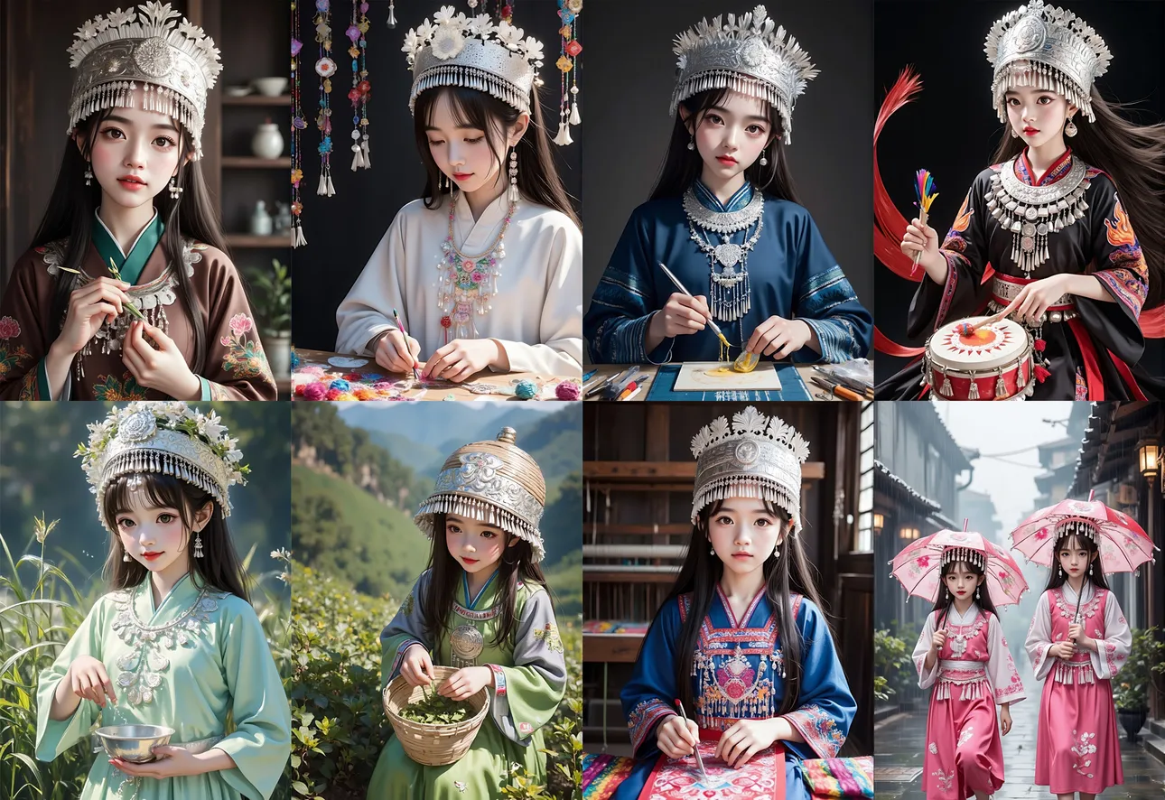 本模型可轻松生成手绘苗族少女素材,内容并具备良好的质感,在精细细节表现上有丰富的表达。