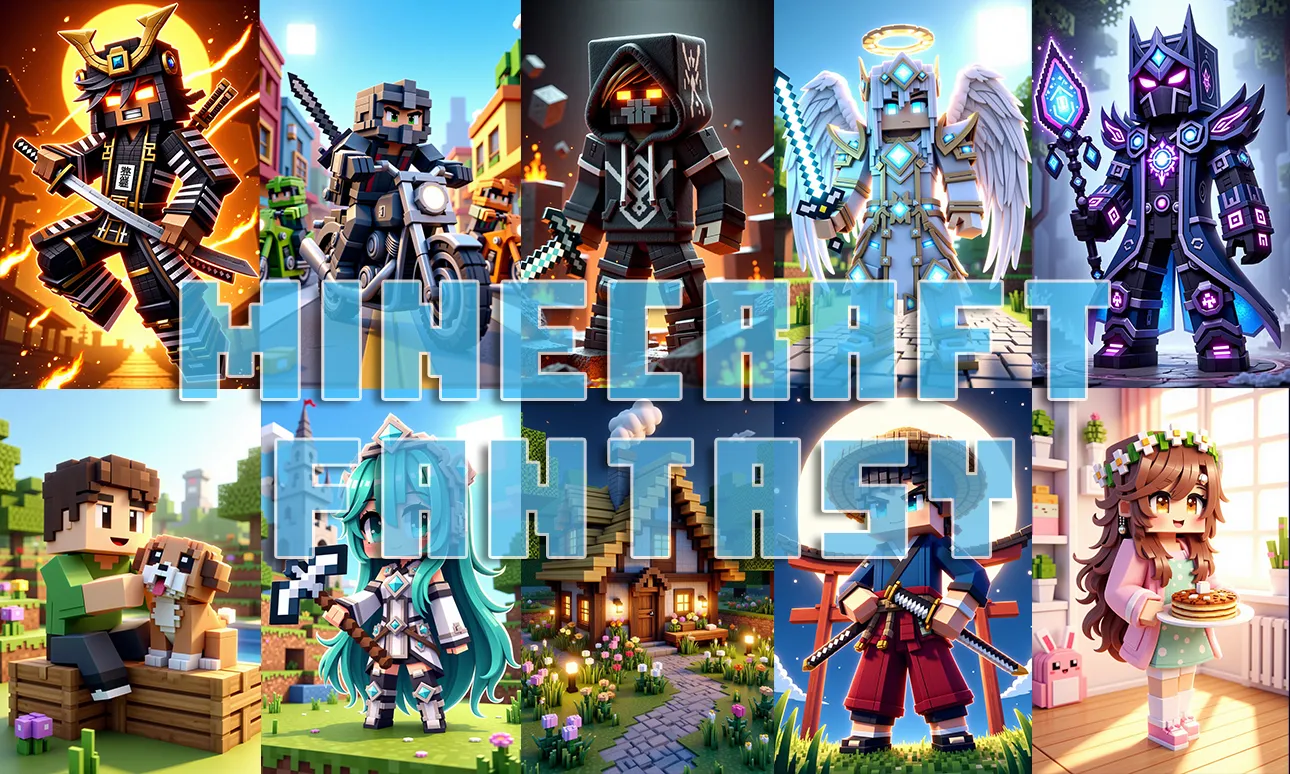1. Minecraft, Photograph, Minecraft game screenshot, vibrant colors, three characters riding motorcycles, street scene, colorful buildings, cartoon style, first character in the foreground, black and gray armor, black helmet, wielding sword, riding a sleek motorcycle, second character to the left, green armor, green helmet, green motorcycle, third character to the right, orange armor, orange helmet, orange motorcycle, bright blue sky, sunny day, playful atmosphere, dynamic action, cityscape background, blocks and pixels, detailed textures, realistic lighting, Minecraft game universe, adventure, exploration, urban setting, animated game environment.