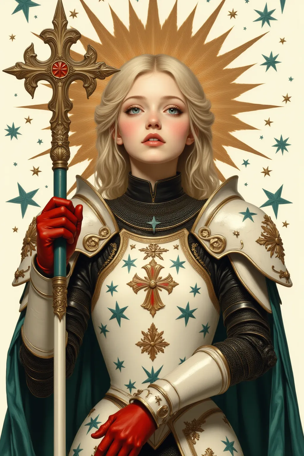 A female knight in ornate armor with a religious motif,illustrated in a stylized folk art manner. She has medium-length blonde hair with a slight curl and rosy cheeks. She wears elaborate white plate armor decorated with celestial patterns - blue stars,red crosses,and golden floral emblems. Her armor features decorative shoulder pauldrons and gauntlets with intricate details. She holds a ceremonial staff/spear with a golden cross at the top and a teal blue shaft with gold ornaments. Her red gloved hand grips the weapon firmly. The background features a dramatic golden sunburst halo behind her head,with radiating orange/gold rays,scattered blue stars,and stylized blue clouds against a white background. The character has a solemn,dignified expression with bright blue eyes. Her outfit includes a visible dark green and blue tabard under the armor with diamond patterns. The overall aesthetic combines medieval religious iconography with folk art decoration. The color palette is dominated by white,gold,teal blue,crimson red,and emerald green,with clean lines and flat colors typical of stylized illustration.,