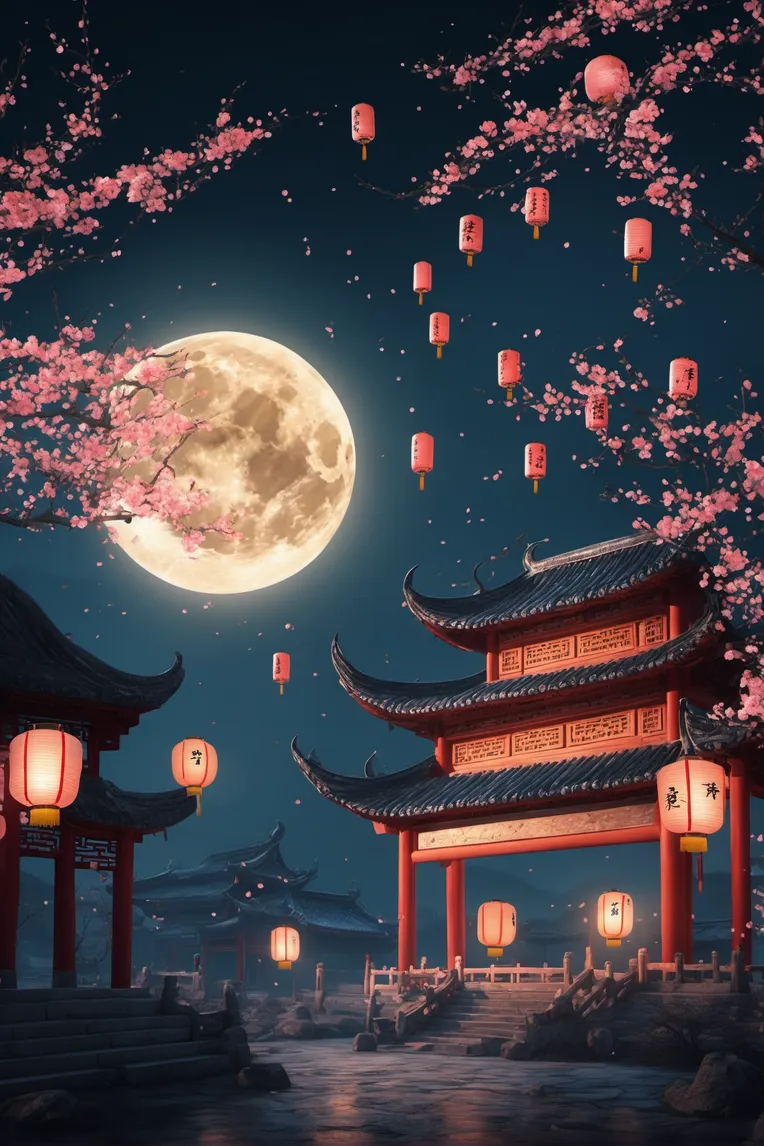 The surreal cg rendering of ancient China, there are many luminous kongming lanterns in the sky, ancient buildings in the south, streets and nights, peach blossoms, peach blossoms on the moon, the moon that creates the moon, 4k, hd, kongming lanterns, ancient buildings, scenery, night scenes, peach blossoms, moon, 4k,
