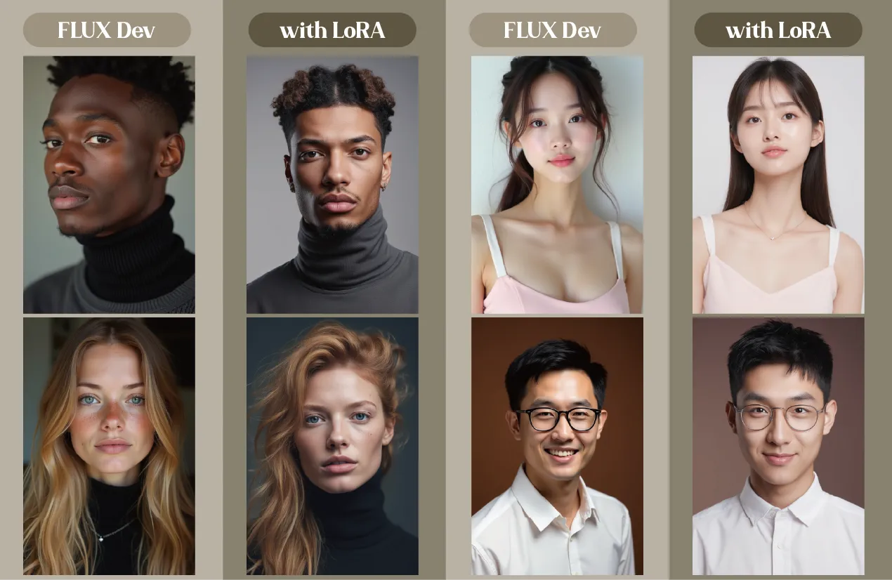 提示词建议:flux.1拥有非常好的自然语言理解力,本lora没有触发词,使用自然语音描述人物特征即可,可参考例图。不同人种可以用Europeans/asians/africans woman/man来指定。