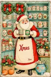 "Describe a heartwarming Christmas scene featuring Santa Claus in a cozy holiday shop. Santa, donning a bright red suit with a fluffy white trim, is standing with a cheerful smile, clutching two festive mugs decorated with holly and festive designs. His white beard is full and fluffy, and he's wearing blue gloves that contrast with his red attire. Behind him, a wooden shelf is adorned with an array of colorful ceramic mugs, each uniquely decorated for the holiday season. Some mugs are adorned with images of Christmas trees, decorations, and joyful scenes, while others are labeled with the word 'Xmas.' The shop is filled with holiday cheer, featuring bright red poinsettias and snow-dusted ornaments on the floor. A large window reveals falling snow outside, enhancing the warm and inviting atmosphere of this delightful holiday setting."