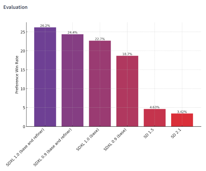 The chart above evaluates user preference for SDXL (with and without refinement) over SDXL 0.9 and Stable Diffusion 1.5 and 2.1. The SDXL base model performs significantly better than the previous variants, and the model combined with the refinement module achieves the best overall performance.