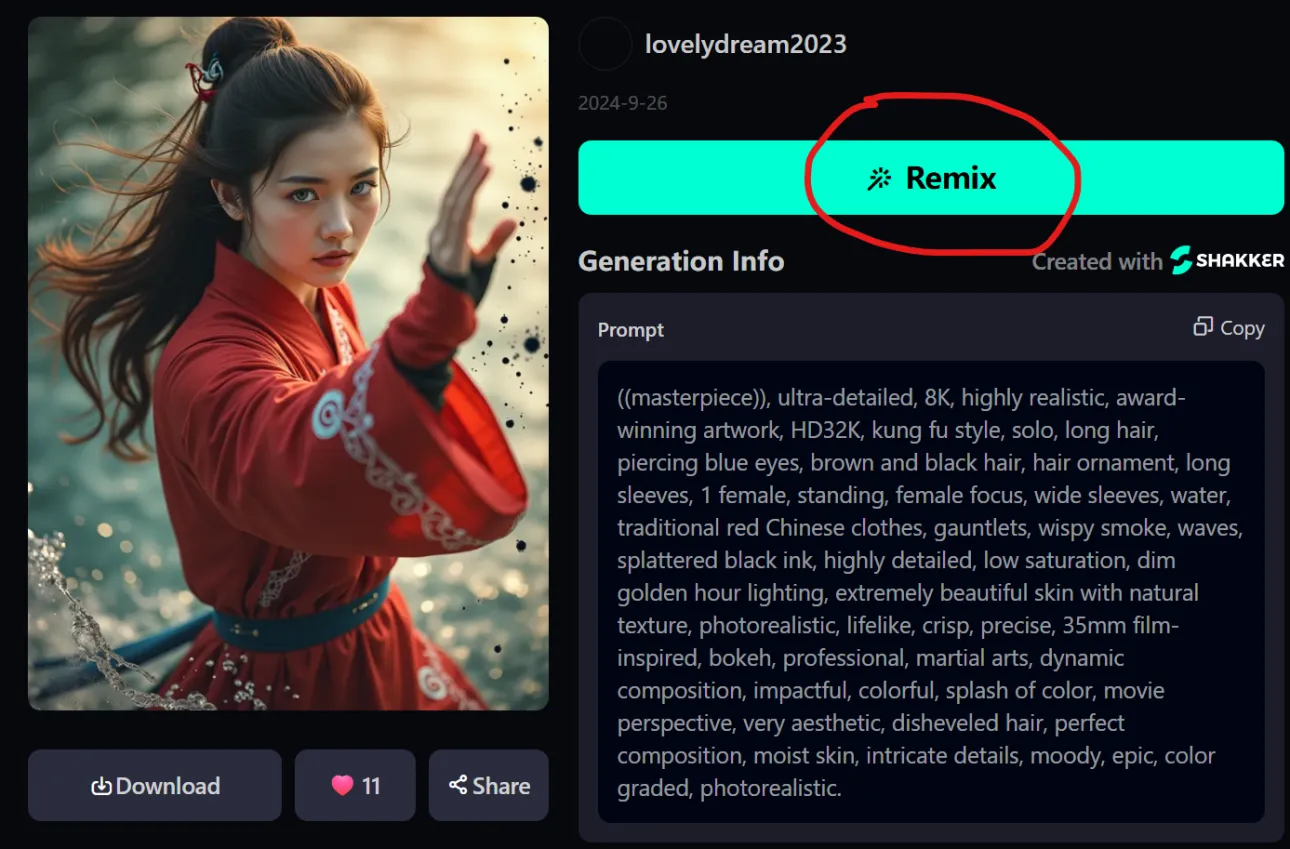 The best way: Firstly Please choose the first row's image from the gallery below, and then click on "REMIX" to quickly refer to prompt words and create artwork.